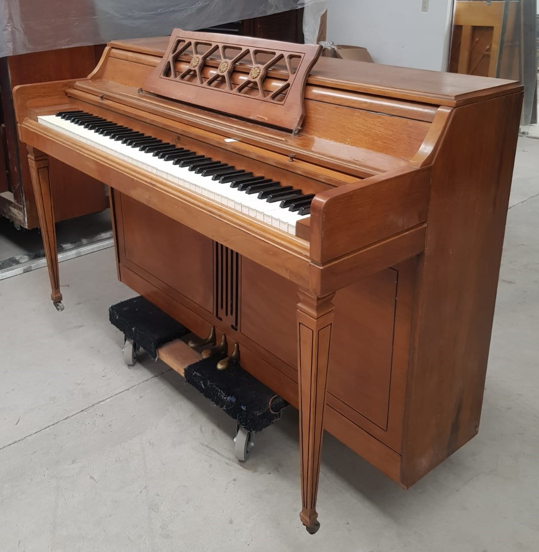 According to Pierce. The dark walnut and brass finishes are beautiful and plays very nice as well. Find Kimball Artist Console Piano now.